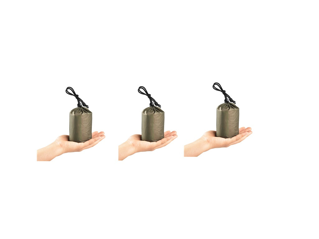 The first aid sleeping bag is made of tin foil paper or tin film. The surface is coated with metal. The inner layer is made of PE plastic film. The inner layer is wrapped around the body to reflect the heat back, so as to keep warm and keep warm.